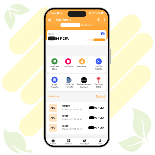 Solution de mobile banking interopérable avec MTN MoMo, Moov Money et Celtiis Cash. Transférez, payez vos factures et gérez votre argent en toute sécurité.